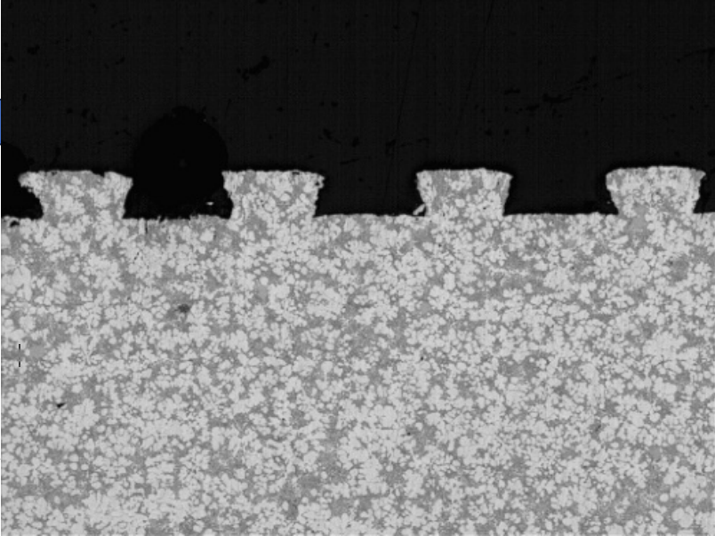 对于采用APS缸孔涂层技术的铝合金缸体,在产品铸造设计阶段不受铝合金牌号与铸造工艺的限制,是因为APS等离子喷涂工艺特性决定的,这就为客户在产品铸造设计提供了更广泛的选择。在缸体进入喷涂单元前,需要对缸孔进行精镗缸孔和刀具粗化,达到设计的缸孔孔径尺寸,为后续喷涂涂层预留空间。成品涂层厚度常规设计为0.1-0.15mm,因此喷涂前的缸孔孔径为成品孔径加大0.2-0.3mm。采用刀具粗化是采用专用成型刀在缸孔表面切削出微型梯形槽,以保证喷涂后涂层与基体良好的结合强度,其结合强度可达40MPa以上。