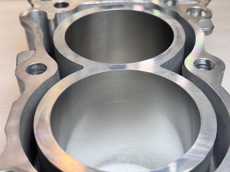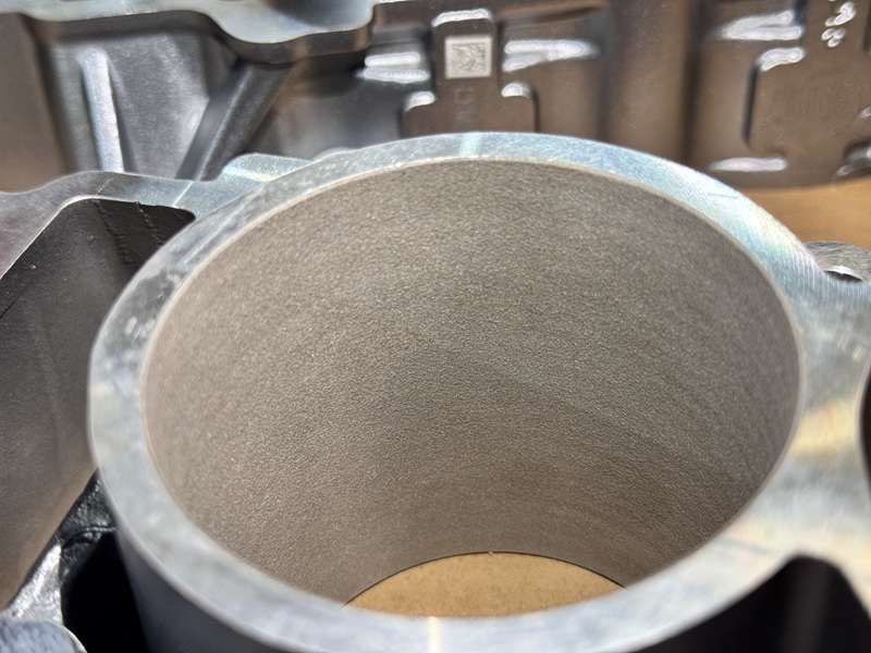 如图所示,喷涂后缸孔表面呈现出均匀的哑光光金属质感,结构致密,此阶段,涂层已具备其核心物理特性,涂层硬度及耐磨性显著高于传统铸铁缸套,同时涂层内部自然形成的、均匀分布的微观孔隙是后续形成储油结构的基础。涂层厚度被精准控制在极薄范围内,在实现卓越功能的同时,最大程度减轻重量并优化热传导。